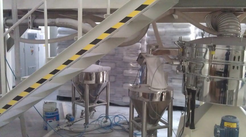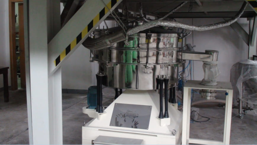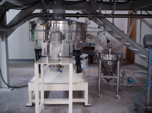 một kho chứa nguyên liệu chân không sau khi nguyên liệu đến máy nghiền với nguyên liệu thô, máy nghiền vào Máy sàng lọc Tumbler, lưới sàng cỡ: 300um; 500um Rây các hạt lớn vào phễu thô, sau đó bằng máy hút chân không đến máy nghiền. Chu kỳ làm việc.